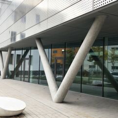 We supported the company Riedel Bau in the production of three conical V-shaped round column formwork. They are made of cast-in-place concrete. Long transport distances and the large dimensions contributed to the decision not to produce the round column formwork as precast elements but in cast-in-place concrete. For this purpose, the structural engineer completely recalculated the integration of the column head into the slabs.