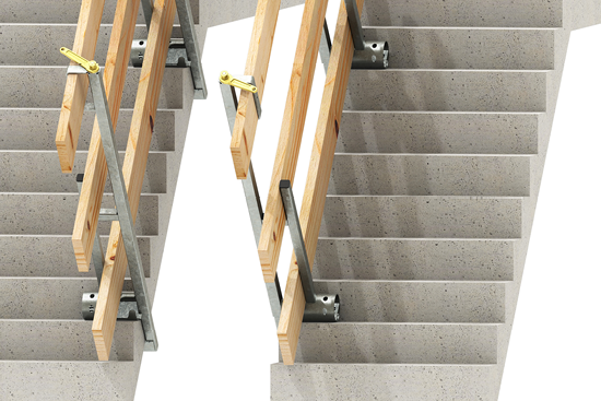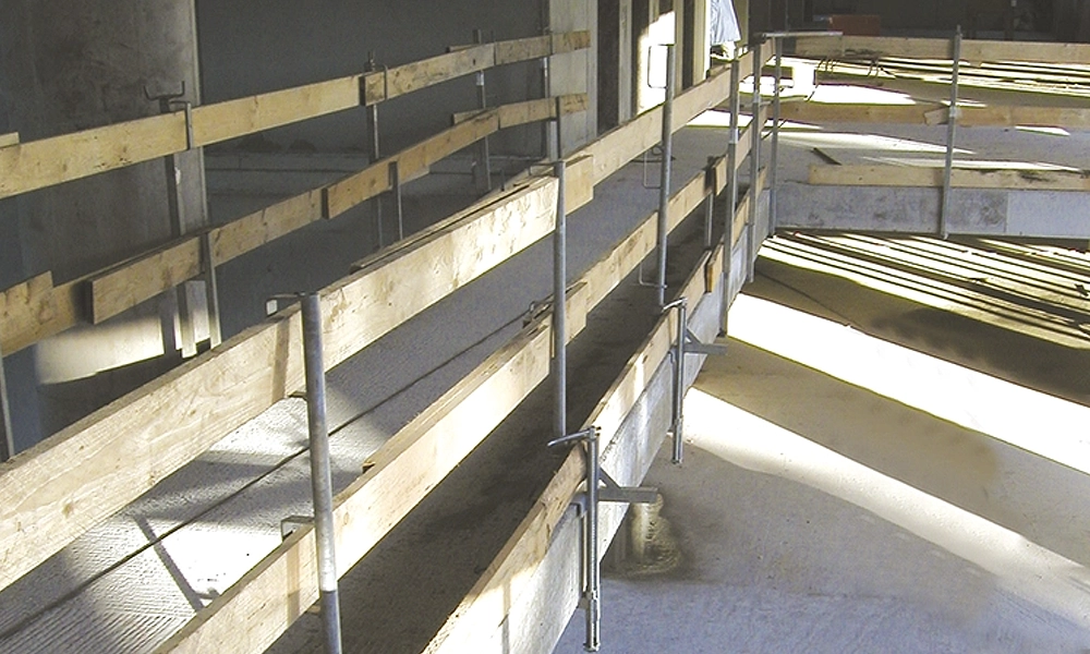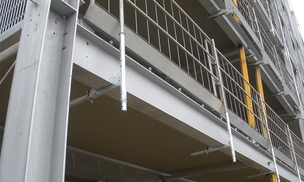 - Systemlösungen nach DIN EN 13374 für temporären Seitenschutz an Decken und Treppen