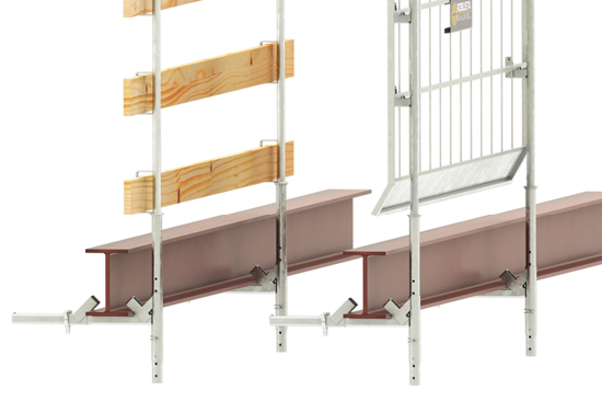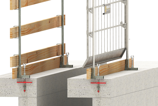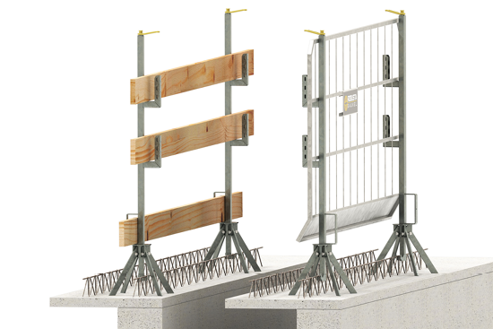 Kombi-Geländerhalter werden senkrecht oder waagerecht am Bauteil montiert. Die materialschonende Klemmlösung bietet einen temporären Seitenschutz an Fertigteilen, Randbalken oder Attiken.