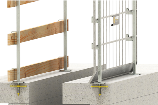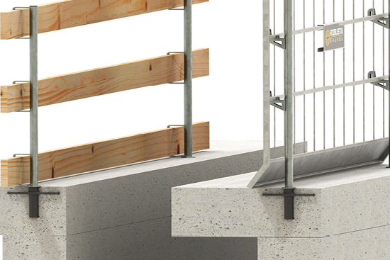 Zur Herstellung eines sicheren, temporären Seiten- bzw. Fallschutzes im Rohbau unterscheidet man zwischen Geländerhaltern, die über vorgeplante Hülsen