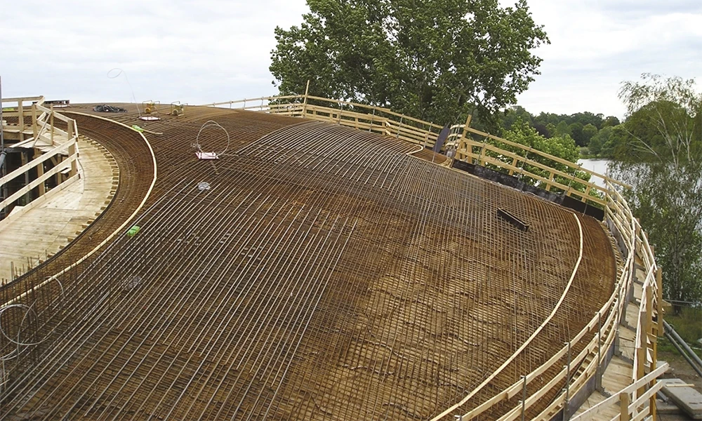 Nach der Betonage werden Schraubfüße auf der fertigen Decke befestigt, mit Steck-Geländern ergänzt und mit S10-Brettern und Gittern komplettiert.