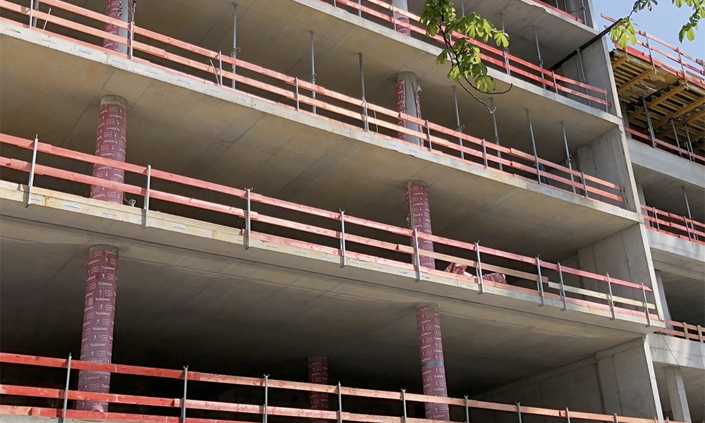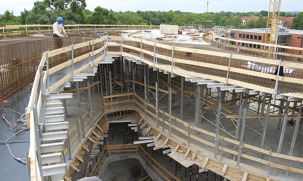 Die Abschalschiene verbindet eine Deckenrandschalung mit Absturzsicherung in einem System. Runde Gebäudeecken lassen sich mit dem passenden Schalmaterial problemlos herstellen.