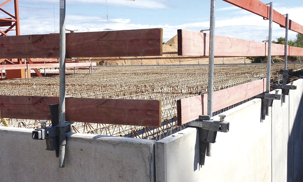 Die Vario-Abschalschiene wird an der Filigrandecke befestigt. In Kombination mit dem Steck-Geländerhalter für Seitenschutzbretter oder Gitterelemente entsteht ein zuverlässiger Seitenschutz entlang der Absturzkante.
