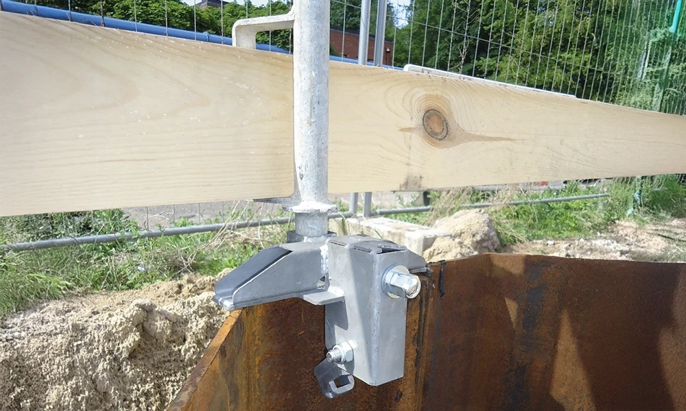 Der Spundwand-Adapter wird auf der Spundwand befestigt und nimmt Steck-Geländerhalter für Seitenschutzbretter oder Gitterelemente auf. So lässt sich an der Spundwand schnell ein durchgängiger Seitenschutz einrichten.