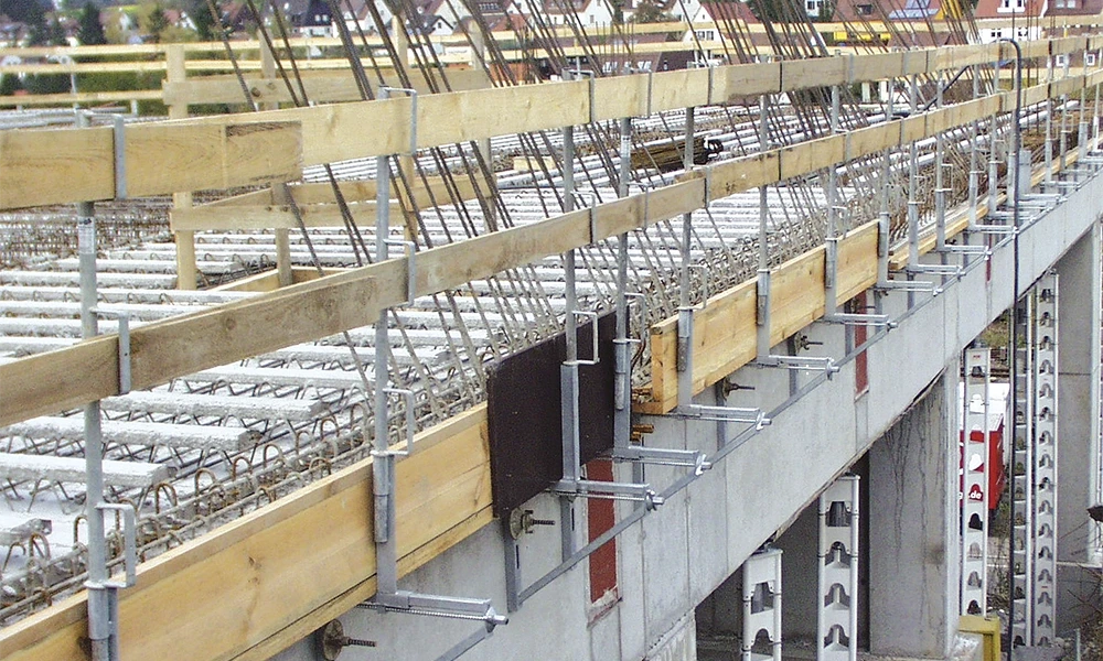 Auskragende Deckenränder oder Konsolen bis 40 cm lassen sich schnell und unkompliziert herstellen. Die Kombi-Konsole verbindet das Schalen von überstehenden Decken und Absturzsicherung. Die Produktkombination ermöglicht den Seitenschutz an Attiken von Staffelgeschossen oder Montagearbeiten am Deckenrand, da die Absturzsicherung außerhalb der Decke befestigt ist.